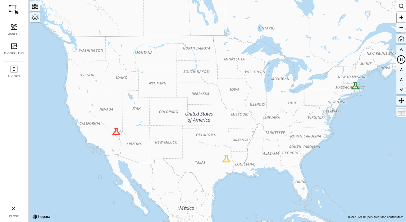 You can also zoom/unzoom by using the scroll feature of your mouse. Try this to familiarize yourself with the gestures. As an exercise, pan to one of the beakers, representing a lab and successively zoom. You will note that the beaker disappears in favor of a floorplan. Continue to zoom and you will see individual pieces of equipment on the floorplan.