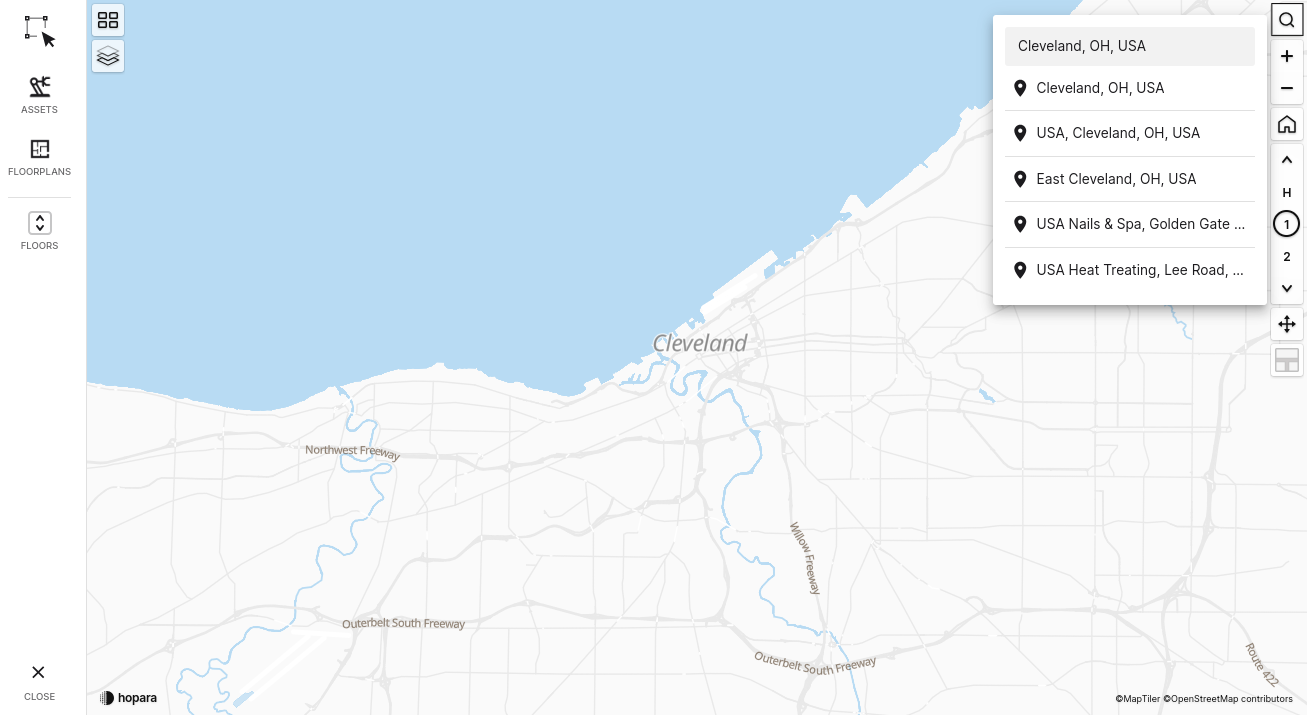 Often you want to move to a specific location, say Cleveland, Ohio. Of course, it is fine to pan to Ohio and then zoom in to see city locations and then move to Cleveland. However, Hopara offers you a rapid transit option. On the right side of the screen you will see a magnifying glass icon. Click on it and type in Cleveland. Since there are multiple cities with this name, you will be prompted to disambiguate your search request. On selecting the correct Cleveland, Hopara will move/zoom to Cleveland, and you will see the display of Figure 6. This is a very fast way to get to a specific location.